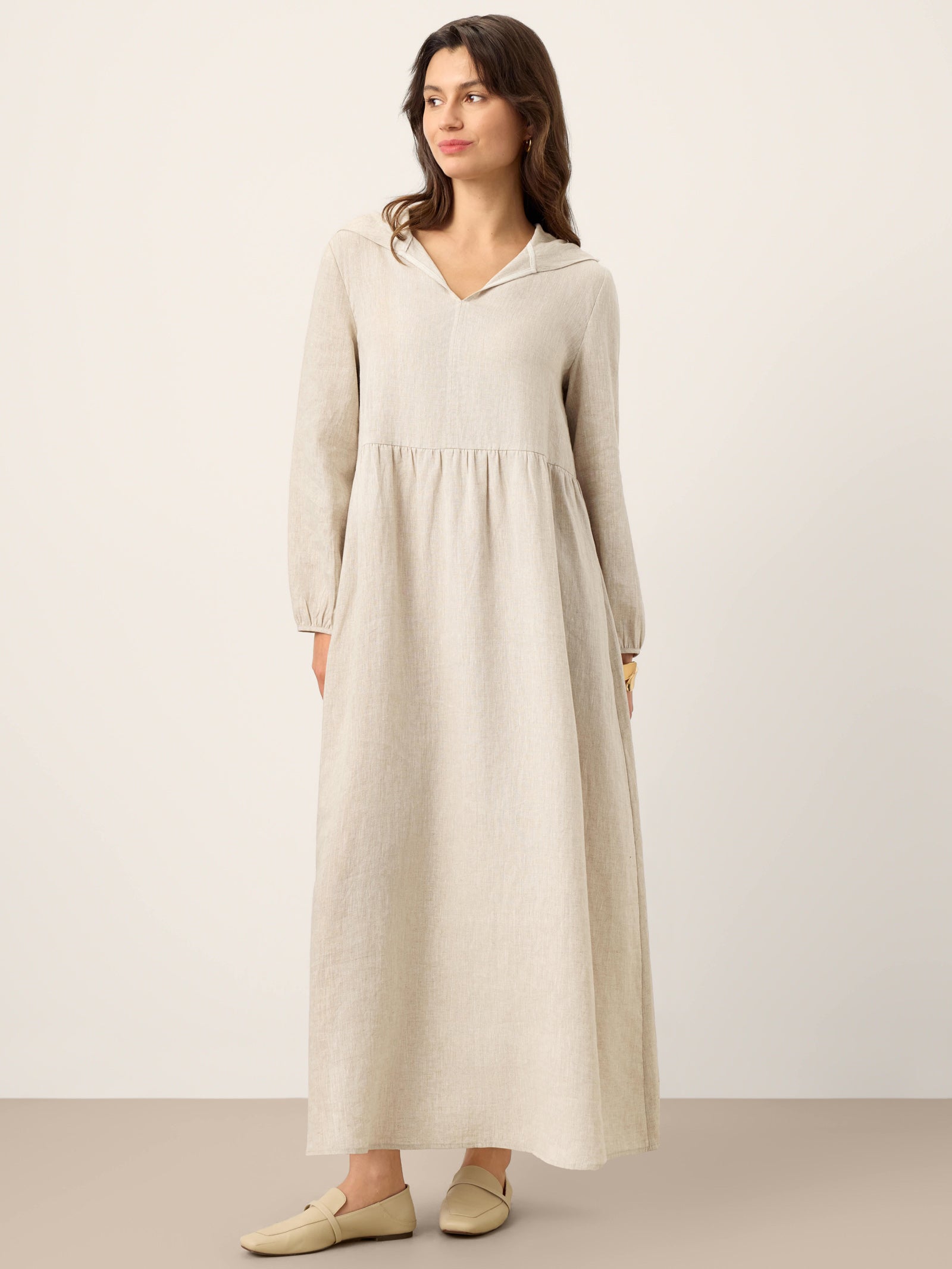 The Avery | Women’s Linen Sculpted Hood Caftan Maxi Dress combines a relaxed caftan shape with a hooded V-neck, long sleeves, and hidden pockets, making it a practical maxi for autumn and winter layering—ideal for women who want comfortable coverage and an easy, laid-back silhouette for everyday wear.
