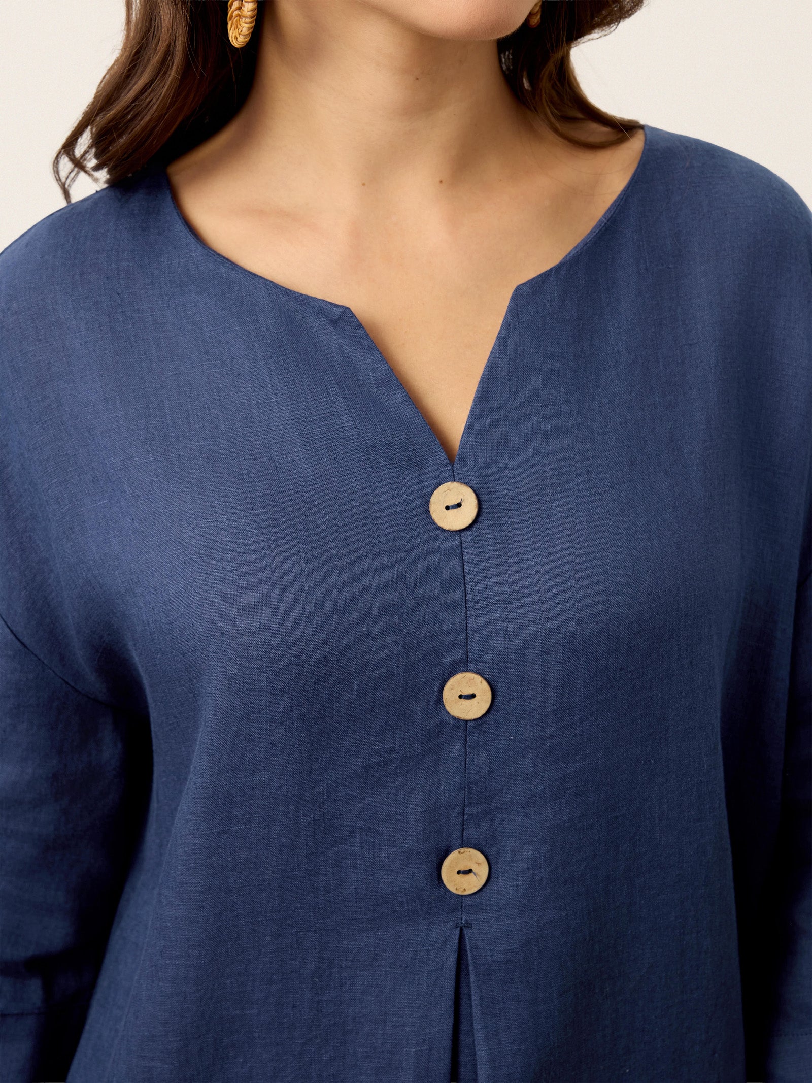 Step into autumn and winter layering with the Hadley | Women’s Navy Linen Notch Neck Pleated Maxi Dress, a structured yet easy-wearing maxi designed for comfortable movement and clean seasonal styling. The notch neckline creates a flattering, elongated line under scarves, coats, or cardigans, while the coconut button placket and subtle pleats add texture and relaxed ease through the body. Finished with wide-cuff seven sleeves, a body-skimming H-line silhouette, and functional side slits for stride-friendly comfort, this navy maxi transitions smoothly from everyday errands to dinner plans—especially when paired with knitwear, boots, or tailored outerwear.