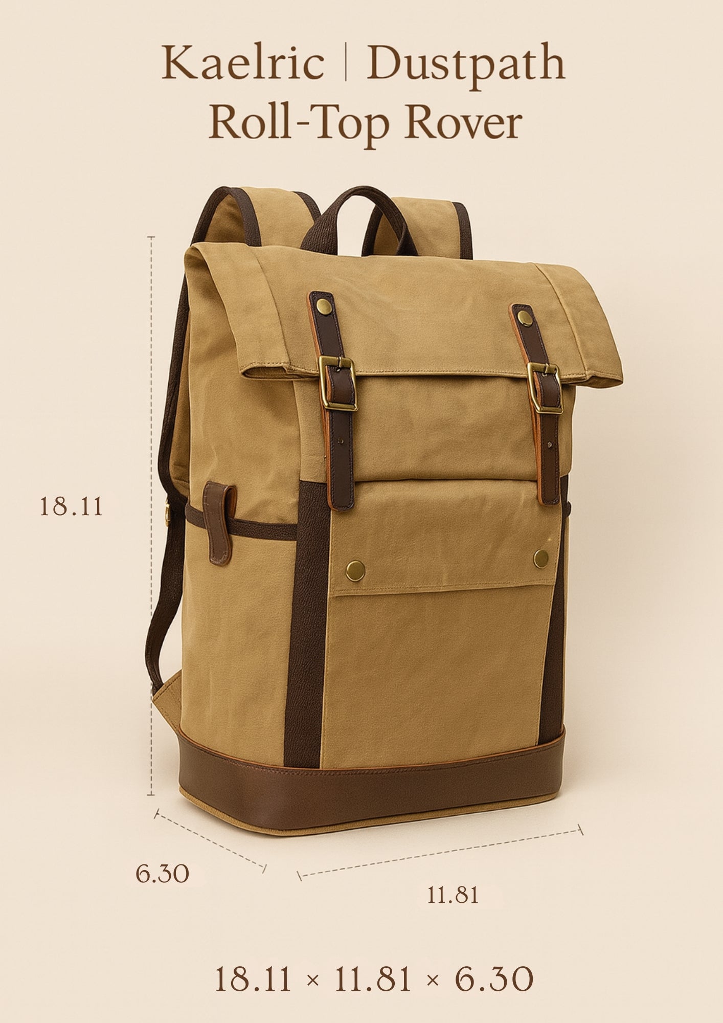 The Kaelric | Dustpath Roll-Top Rover combines vintage charm with modern functionality, making it the ideal choice for daily use or weekend getaways. With its spacious design and durable materials, this backpack is perfect for carrying your essentials while traveling in style.