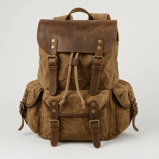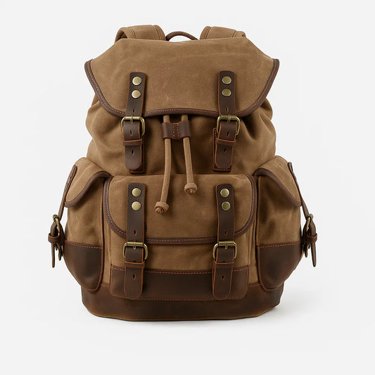 Crafted from water-repellent, sturdy waxed cotton canvas, and vegan leather, this backpack is built to withstand dirt, wear, and water, ensuring it remains a reliable companion for all your adventures.